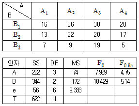 다음은 모수인자 A, B에 대한 반복 없는 2원 배치 실험 데이터 및 분산분석표이다. 이 실험에 관한 내용으로 틀린 것은? (단, 실험의 품질 특성은 망대특성이다.)