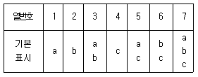 기본표시가 [표]와 같은 LS(27)형 직교배열표에서 요인 A, B, C, D 를 순서대로 1, 3, 5, 7열에 배치한 경우 A×C 와 별명관계에 있는 요인은?