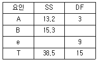 아래의 반복이 없는 2요인실험의 분산분석표를 유의수준 α=0.05의 조건으로 맞게 해석한 것은? (단, F0.95(3.9)=3.86이다.)