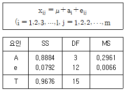 아래의 보기와 같은 변량모형(random effect model)에서 분산분석의 결과를 이용한