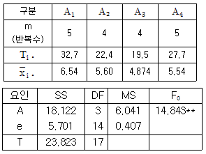 다음은 철분에 함유된 함량을 측정한 데이터와 분산분석표이다. 유의수준 0.05로 μ(A1)을 구간추정하면 약 얼마인가? (단, t0.95(14)=1.761, t0.975(14)=2.145, t0.95(3)=.353, t0.975(3)=3.182이다.)