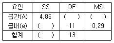 다음은 반복수가 일정하지 않은 1요인실험의 분산분석표이다. F0(검정통계량)의 값은 약 얼마인가?