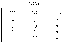 A, B, C, D 4개의 작업은 모두 공정1을 먼저 거친 다음에 공정2를 거친다. 최종작업이 공정2에서 완료되는 시간을 최소화하기 위한 존슨의 방법에 의한 작업순서로 맞는 것은?