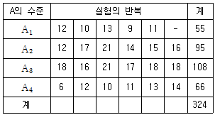 4종류의 다이어트 식단 A1, A2, A3, A4가 있다. 식이요법이 혈액응고 시간에 영향을 주는가를 알아보기 위하여 반복이 같지 않은 1요인실험을 실시한 결과 다음과 같은 데이터를 얻었다. 요인 A 의 제곱합(SA)은 약 얼마인가?