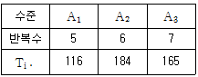 반복이 같지 않은 모수모형의 1요인실험에 관한 데이터는 다음과 같다. 요인 A 의 제곱합(SA)은 약 얼마인가?