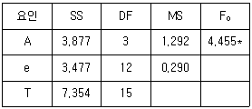 모수모형인 반복이 일정한 1요인 실험에서 다음과 같이 분산분석을 하였다.