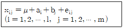 다음은 모수요인 A와 변량요인 B인 난괴법의 데이터 구조식이다. 기본가정이 아닌 것은?