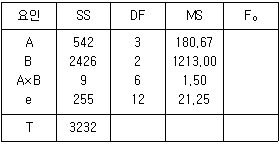 다음 표와 같은 모수모형 반복 있는 2요인 실험의 분산분석에서 교호작용을 무시했을 때의 요인 B의 분산비(F0)는 약 얼마인가?