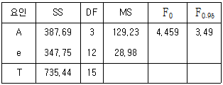 다음은 반복이 일정한 어느 변량모형 1요인 실험결과이다. 실험에 관한 설명 중 틀린 것은?