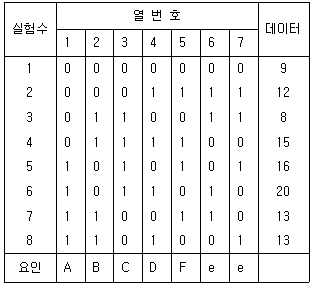표와 같은 L8(27) 직교배열표에서 요인 D의 효과는 얼마인가?