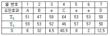 강력 접착제의 응집력을 높아가 위해서 4요인 A, B, C, D가 중요한 작용을 한다는 것을 알고 각 각 2수준씩 선택하여 Ls(27)직교 배열표를 이용한 실험의 결과가 다음과 같을 때, 총 제곱합(ST)은? (단, 제곱합