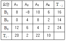 A는 4수준, B는 3수준의 2요인 실험에서 아래의 데이터가 얻어졌다. A요인의 제곱합(SA)을 구하면 약 얼마인가?