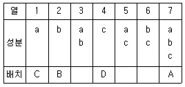 L8(27)에서 4개의 요인 A, B, C, D를 다음과 같이 배치하였다면 5열에서 교락되는 2요인 교호작용은?