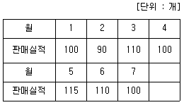 표의 데이터를 참조하여 5개월 이동평균법에 의한 8월의 판매실적은 약 몇 개인가?