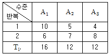 다음 표와 같이 1요인 실험(일원배치 실험) 데이터에서 총제곱합(ST)은 약 얼마인가?