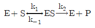 효소 및 기질이 효소-기질을 형성하는 가역 반응과 생성물 P를 이탈시키는 착화합물의 비가역 분해과정인 다음의 식에서 Michaelis 상수 Km은? (단, k1=1.0×107M-1s1,k-1=1.0×102s-1, k2=3.0×102s-1)