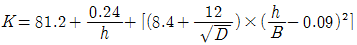직각 3각 웨어에서 웨어의 수두 0.2m, 수로폭 0.5m, 수로의 밑면으로부터 절단 하부점 까지의 높이 0.9m일 때, 아래의 식을 이용하여 유량(m3/min)을 구하면?