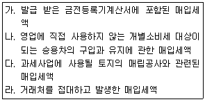 다음 중 부가가치세의 납부세액을 계산할 때 공제 받을 수 있는 매입세액은 모두 몇 개인가?