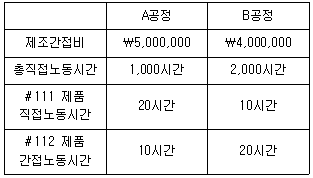 (주)대한은 A, B 두 공정을 이용하여 #111제품과 #112제품 등을 생산하며, 제조간접비는 직접노동시간을 기준으로 배부한다. #111 제품의 A공정과 B공정의 제조간접비로 옳은 것은?