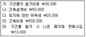 2017년 3월 1일에 (주)상공은 공장을 신축할 토지를 ₩200,000에 매입하였다. 취득한 토지에는 구건물이 있어 이를 철거하고 새로운 공장건물의 건설공사를 착공하여 2018년 11월말에 완공하였다. 이 기간 중에 발생한 원가와 수입은 다음과 같다. (주)상공이 장부에 기록해야 할 토지의 취득원가는 얼마인가?