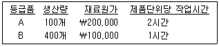 (주)대한은 등급품 A, B를 생산하여 판매하고 있다. 가공원가 배분을 위한 등급품 A, B의 등가계수는 작업시간을 기준으로 3 : 1이다. 다음은 10월 중 자료이다.