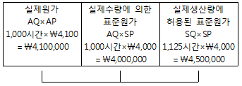 (주)대한은 표준원가계산제도를 사용하고 있다. 아래 직접노무비 차이분석에서 임률차이로 옳은 것은? (AP : 실제가격, AQ : 실제 수량, SP : 표준가격, SQ : 표준수량)