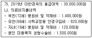 다음은 근로소득자 이한경씨의 의료비지출내역이다. 이한경씨의 2019년도 의료비세액공제가 적용되는 대상금액은 얼마인가? (단, 의료비를 지출한 대상은 모두 이한경씨의 기본공제대상자이고 이한경씨가 의료비공제를 받는다.)