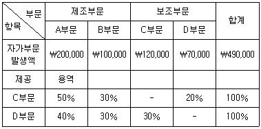 일반적으로는 보조부문 상호간의 대체를 단 한번으로 한정 하고, 그 결과로서 집계된 보조부문비는 직접배부법에 의하여 각 제조부문에 배부하는 방법이 사용된다.