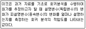 다음이 설명하는 용어로 옳은 것은? 이것은 과거 자료를 기초로 회귀분석을 수행하여 원가를 추정하고자 할 때 설명변수(독립변수)의 변화가 피설명변수(종속변수)의 변화를 얼마나 설명하는지를 측정하는 회귀 분석의 적합도를 나타내는 값이다.