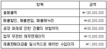 다음은 제조업을 영위하는 상공상사의 제10기(2016.1.1~2016.12.31) 수익항목에 관한 자료이다. 상공상사는 김상공씨가 운영하는 개인기업인 경우 사업소득의 총수입금액을 계산하면 얼마인가?