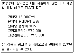 다음 자료에 의해 (주)상공이 \20,000의 순이익을 달성하고자할 경우, 회사가 부담해야하는 최대 광고선전비는 얼마인가?
