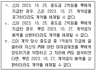 甲은 2023. 9. 30. 乙에게 자신 소유의 X부동산을 3억원에 매도하되, 계약금 2천만원은 계약 당일, 중도금 2억원은 2023. 10. 30., 잔금 8천만원은 2023. 11. 30.에 지급받기로 하는 매매계약을 체결하고, 乙로부터 계약 당일 계약금 전액을 지급받았다. 다음 설명 중 옳은 것을 모두 고른 것은? (특별한 사정은 없으며, 다툼이 있으면 판례에 따름)