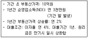 부동산투자시 (ㄱ)타인자본을 활용하지 않는 경우와 (ㄴ)타인자본을 50% 활용하는 경우, 각각의 1년간 자기자본수익률은? (단, 주어진 조건에 한함)