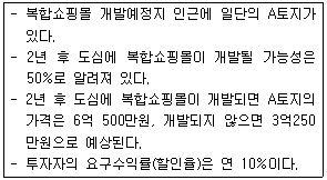 복합쇼핑몰 개발사업이 진행된다는 정보가 있다. 다음과 같이 주어진 조건 하에서 합리적인 투자자가 최대한 지불할 수 있는 이 정보의 현재가치는? (단, 주어진 조건에 한함)