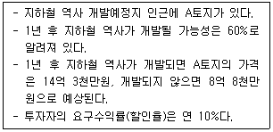 지하철 역사가 개발된다는 다음과 같은 정보가 있을 때, 합리적인 투자자가 최대한 지불할 수 있는 이 정보의 현재가치는? (단, 주어진 조건에 한함)