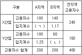 각 지역과 산업별 고용자수가 다음과 같을 때, A지역 X산업과 B지역 Y산업의 입지계수(LQ)를 올바르게 계산한 것은? (단, 주어진 조건에 한하며, 결과값은 소수점 셋째라리에서 반올림함.)