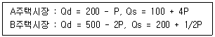 A주택시장과 B주택시장의 함수조건이 다음과 같다. 거미집이론에 의한 두 시장의 모형형태는? (단, x축은 수량, y축은 가격, 각각의 시장에 대한 P는 가격, Qd는 수요량, Qs는 공급량, 다른 조건은 동일함)