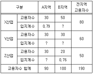 각 지역과 산업별 고용자수가 다음과 같을 때, A지역과 B지역에서 입지계수(LQ)에 따른 기반산업의 개수는? (단, 주어진 조건에 한하며, 결과 값은 소수점 셋째자리에서 반올림함)