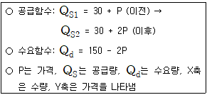 A지역 아파트시장에서 수요함수는 일정한데, 공급함수는 다음 조건과 같이 변화하였다. 이 경우 균형가격(ㄱ)과 공급곡선의 기울기(ㄴ)는 어떻게 변화하였는가?(단, 가격과 수량의 단위는 무시하며, 주어진 조건에 한함)