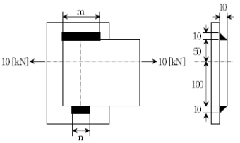 그림과 같이 필렛 용접된 두 금속판의 좌우로 10 [kN]의 하중이 가해질 때, 필요한 용접부 최소 길이 m, n에 가장 근사한 치수[mm]는? (단, 용접부의 허용전단응력은 10 [N/mm2]이다) (순서대로 m, n)
