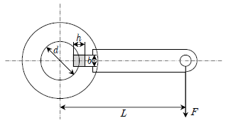 그림과 같이 지름이 d인 축에 평행키가 있을 때, 중심으로부터 L만큼 떨어져 있는 레버에 작용할 수 있는 최대 힘 F는? (단, 키의 너비, 깊이, 길이는 각각 b, h, l 이고 단면에 작용하는 허용전단응력은 T0 이다)