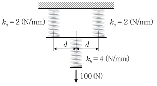 좌우대칭으로 연결된 스프링에 하중 100N이 가해지고 있다. 상부 스프링 두 개의 스프링상수(ka)는 각각 2N/mm이고, 하부 스프링의 스프링상수(kb)는 4N/mm이다. 전체 늘어난 길이[mm]는? (단, 모든 부재의 자중은 무시한다)