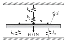 그림과 같이 4개의 스프링에 의해 지지되는 강체의 중앙에 600N의 하중을 가하여 강체가 60mm 내려갈 때, 스프링상수 k3[N/mm]의 값은? (단, 스프링상수 값은 k1=2k3, k2=4k3의 관계를 가지며, 스프링과 강체의 무게는 무시한다.)