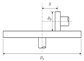 그림과 같이 원판 마찰차를 사용한 무단변속장치가 미끄럼 없이 10W의 동력을 전달하고 있다. 구동축 원판의 지름 DA는 100mm, 종동축 원판의 지름 DB는 20mm이고, 종동축 원판은 구동축 원판의 중심으로부터 20mm인 X만큼 떨어져 있다. 구동축 원판이 50rpm으로 회전하고 있을 때, 종동축에 작용하는 토크[Nㆍmm]는? (단, π=3이다)