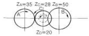 그림의 스퍼기어 열에서 기어 A가 800 rpm 으로 회전할 때 기어 B의 회전수는? (단, 그림 중 의 숫자는 각 기어의 잇수임.)