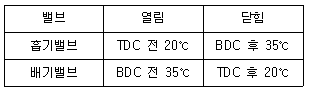 4행정 기관의 흡, 배기 밸브 개폐시기가 다음 표와 같을 때, 밸브 겹침(over lap)은 몇 도인가?