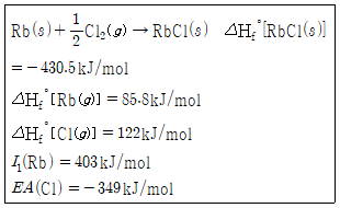 격자 에너지는 고체 이온 결합 화합물 1몰의 모든 이온을 기체 상태의 이온으로 완전히 분리하는 데 필요한 에너지이다. 다음 자료를 본-하버 순환(Born-Haber cycle)에 적용하여 계산한 RbCl의 격자 에너지[kJ/ol]는? (단, I1은 1차 이온화 에너지, EA는 전자 친화도이다.)