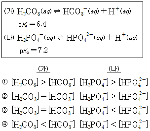 (가)와 (나)는 두 완충 용액의 해리 평형식이다. 완충 용액의 pH가 각각 6.4일 때, 각 완충 용액의 산과 염기의 상대적인 농도를 비교한 것으로 옳은 것은? (단, Ka는 산 해리 상수이다.)