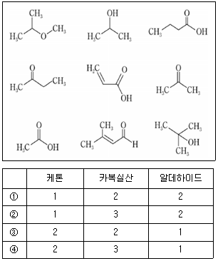 <보기>에서 케톤, 카복실산, 알데하이드 작용기를 가진 분자 각각의 총 수를 옳게 나열한 것은?