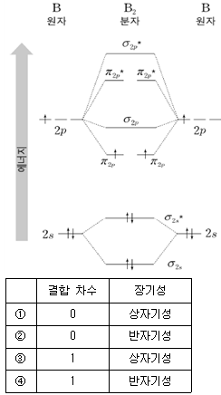 다음은 B2 분자에 대한 궤도함수 에너지 준위 도표이다. B2 분자의 결합 차수와 자기성이 옳게 연결된 것은?